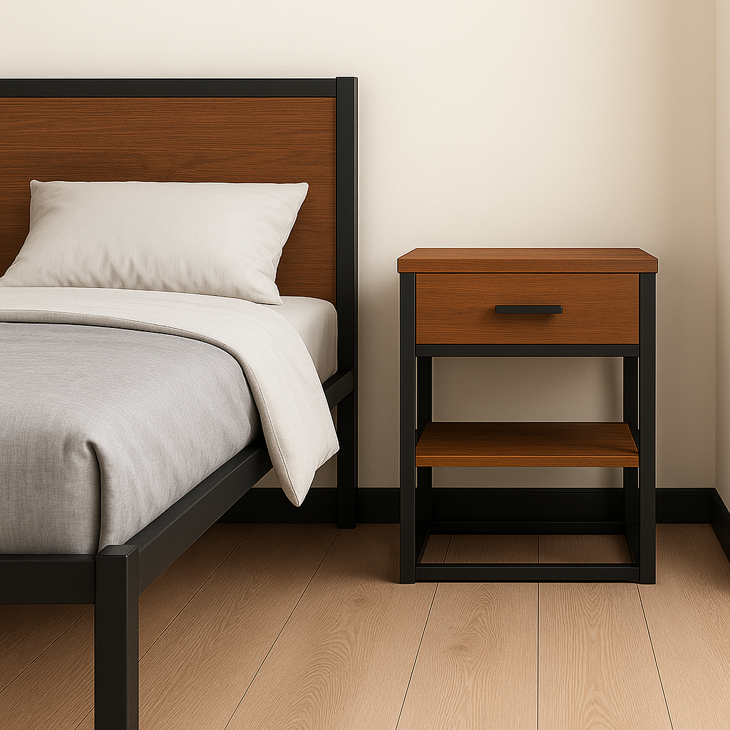 Ručně vyráběný noční stolek v industriálním stylu kombinuje pevnou ocel a masivní dřevo. Elegantní černý rám dodává konstrukci stabilitu, zatímco dřevěný korpus s praktickou zásuvkou a policí poskytuje dostatek prostoru pro uložení věcí.